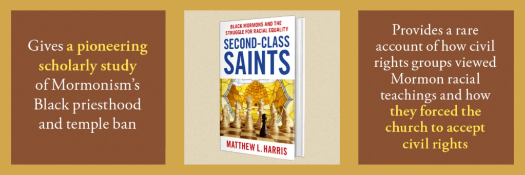 “Second-Class Saints is a masterful exploration of the Black struggle for racial equality within The LDS Church. Harris dissects the entrenched history of documented white supremacy Among church leadership and its theology, revealing a compelling, yet often overlooked, Chapter of religious history.” — Darron T. Smith, author of Black And Mormon