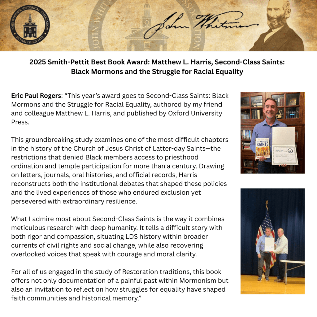 “Extraordinary. That’s the word for “Second-Class Saints: Black Mormons and the Struggle for Racial Equality,” a 2024 book-of-the-year candidate written by Colorado State University-Pueblo historian Matthew L. Harris.” — Richard Ostling, Religion Unplugged